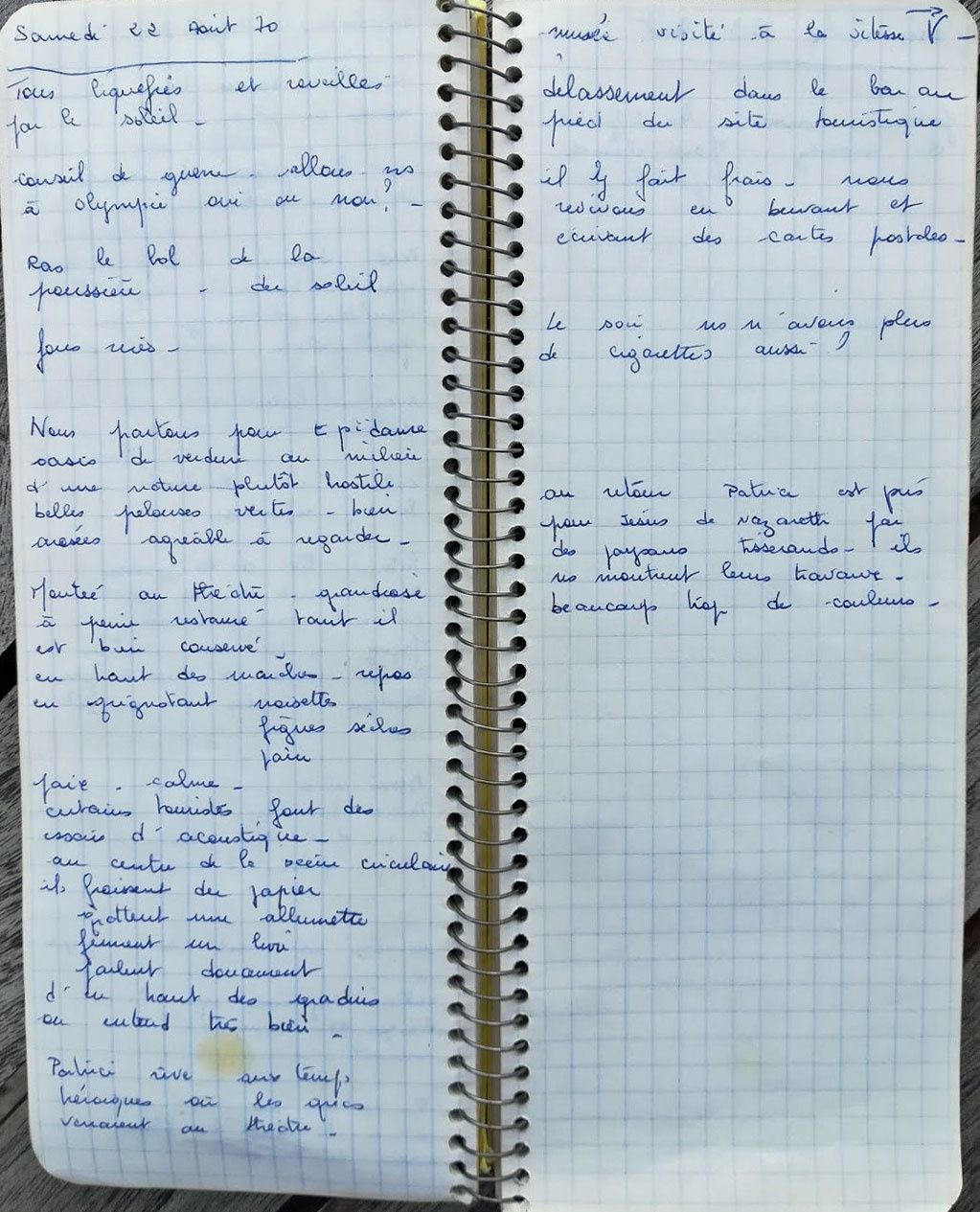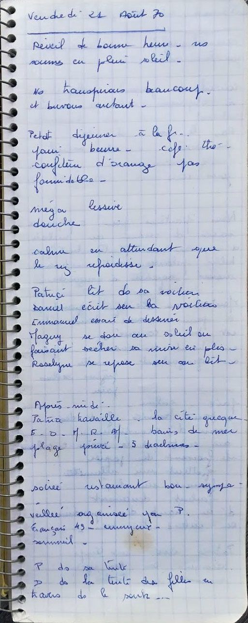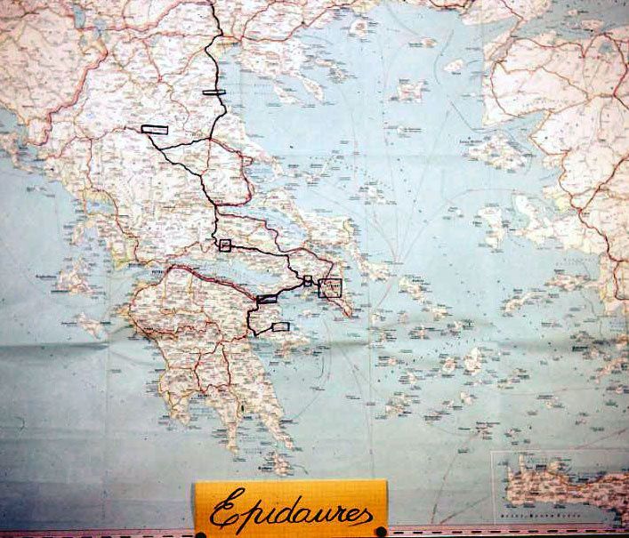 Carte de la Grèce : Épidaure encadré le plus au Sud - Notes des 21 et 22 Août 1970 dans le carnet de bord de Anne-Marie - Aucune note pour la journée du 23 Août.
