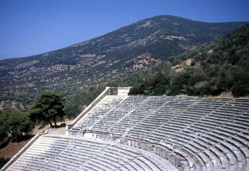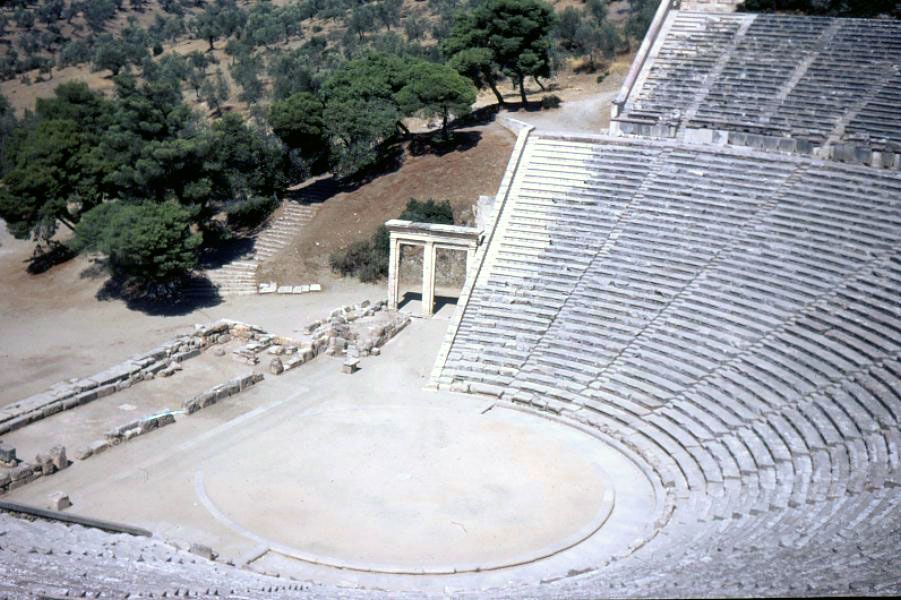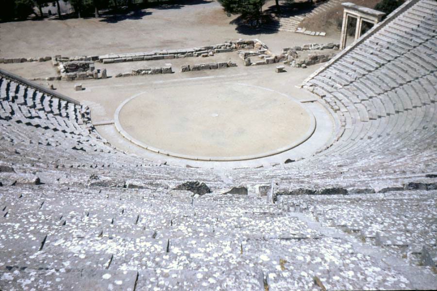 On doit la construction du Théâtre à Polyclète le Jeune. Les travaux furent entamés en 330 avant J.C. Jusqu’à 14000 personnes peuvent prendre place sur les gradins de ce vaste hémicycle … Ce Merveilleux édifice est aujourd’hui le symbole du théâtre grec antique.